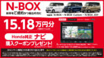 N-BOXを新車をご成約かつ届出の方にHonda純正ナビ購入クーポン15.18万円分プレゼント!