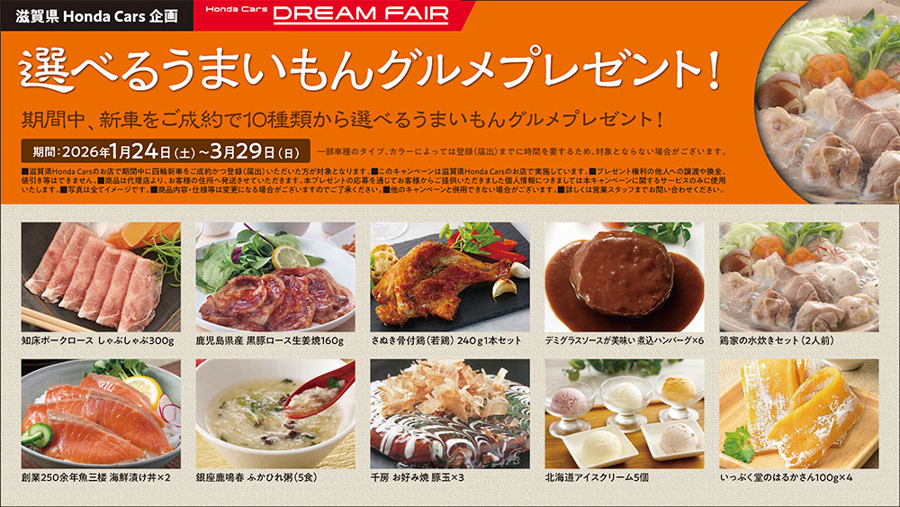 期間中、新車をご成約で10種類から選べるうまいもんグルメプレゼント!